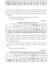 На основі цих даних, можна зробити висновок, що Київська область має більшу загальну земельну площу ніж Запорізька, але в Київській області є менша посівна площа порівняно з Запорізькою. Найбільшу частку у % до посівної площі займають зернові культури як у Запорізькій так і в Київській областях. Досить велику частку у % до посівної площі у Запорізькій області займають технічні культури, а трохи меншу – кормові. У Київській області навпаки. Найменшу частку у двох областях займає картопля та овочево-баштанні культури.