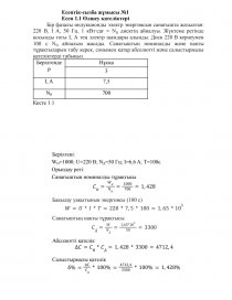 Бір фазалы индукционды электр энергиясын санағышта жазылған: 220 В, I А, 50 Гц, 1 кВт∙сағ = NH дисктің айналуы. Жүктеме ретінде қосынды тогы I, А тең электр шамдары алынды. Диск 220 В кернеумен 100 с NH айналым жасады. Санағыштың номиналды және нақты тұрақтыларын табу керек, сонымен қатар абсолютті және салыстырмалы қателіктерді табыңыз.