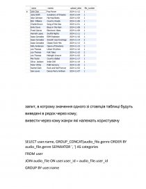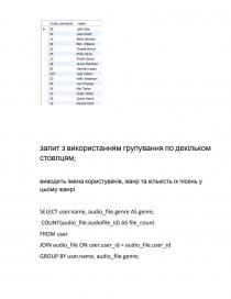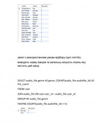 виводить імена користувачів, жанр та кількість іх пісень у цьому жанрі