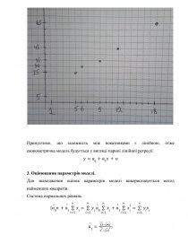 Припустимо, що залежність між показниками є лінійною, отже економетрична модель будується у вигляді парної лінійної регресії: