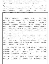 Фільтруванням називають процес розділення неоднорідних систем з твердою дисперсною фазою крізь пористі фільтрувальні перегородки, що пропускають дисперсійне середовище і затримують тверді частинки. Залежно від стану дисперсійного середовища розрізняють фільтрування рідин і фільтрування газів.