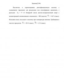Рассчитать и спроектировать ректификационную колонну с клапанными тарелками для разделения под атмосферным давлением, с расходом GF = 9 т/ч бинарной смеси ацетон-изопропиловый спирт с концентрацией низкокипящего компонента – НК (ацетон) [pic 1]= 46 % (масс). Исходная смесь поступает в колонну при температуре кипения. Требования к чистоте продуктов: [pic 2]= 96 % (масс), [pic 3]= 6 % (масс).