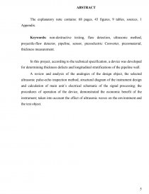 A review and analysis of the analogies of the design object, the selected ultrasonic pulse-echo inspection method, structural diagram of the instrument design and calculation of main unit’s electrical schematic of the signal processing; the procedures of operation of the device, demonstrated the economic benefit of the instrument; taken into account the effect of ultrasonic waves on the environment and the test object.