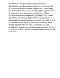 Всякое тело изменяет свойства окружающего его пространства - создает в нем гравитационное поле. Это поле проявляет себя в том, что помещенное в него другое тело оказывается под действием силы. Об «интенсивности» гравитационного поля, очевидно, можно судить по величине силы, действующей в данной точке на тело с массой, равной единице. В соответствии с этим величину называют напряженностью гравитационного поля: G=Fm. В этой формуле F есть гравитационная сила, действующая на материальную точку массы m в данной точке поля. Размерность G совпадает с размерностью ускорения. Напряженность поля тяготения вблизи поверхности Земли равна ускорению свободного падения. Потенциал гравитационного поля. Пусть гравитационное поле создается закрепленной в начале координат материальной точкой массы m. Тогда на материальную точку массы m′, находящуюся в точке с радиус-вектором r, будет действовать сила. Потенциальная энергия точки m′ определяется в этом случае выражением: U=−γmm′r. потенциальная энергия при r=∞ принята равной нулю. можно трактовать также как взаимную потенциальную энергию материальных точек m′и m. Из видно, что каждой точке поля, создаваемого материальной точкой m, соответствует определенное значение потенциальной энергии, которой обладает в этом поле материальная точка m′. Поэтому поле можно характеризовать потенциальной энергией, которой обладает в данном месте материальная точка с m′=1 Величину φ=Um′. называют п о т е н ц и а л о м потенциалом гравитационного поля. В этой формуле U есть потенциальная энергия, которой обладает материальная точка массы m′ в данной точке поля. Потенциал поля, созданного материальной точкой массы m на расстоянии r от нее: Зная потенциал поля, можно вычислить работу, совершаемую над частицей m′ силами поля при перемещении ее из положения 1 в положение 2. Эта работа будет равна: A1−2=U1−U2=m(φ1−φ2 Согласно сила, действующая на частицу m′, равна F=m′G, а потенциальная энергия этой частицы равна U=m′φ. Р Так как F=−∇U, т. е. m′G=−∇(m′φ). Вынеся из-под знака градиента константу m′ и сократив затем на эту константу, придем к соотношению между напряженностью и потенциалом гравитационного поля: Принцип суперпозиции гравитационных полей Принцип независимости действия сил для полей приводит к принципу их суперпозиции: гравитационное поле, создаваемое несколькими телами, равно геометрической сумме гравитационных полей, возбуждаемых этими телами в отдельности. Математически этот принцип выражается формулами: На основе этих формул можно вычислить гравитационное поле любого тела. Для этого надо мысленно разбить тело на малые части, и подсчитать характеристики поля. Гравитационное поле Земли является силовым полем, которое обусловлено притяжением ее массы и центробежной силой, возникающей как следствие вращения Земли. Гравитационное поле Земли: зависит (хотя и в незначительной степени) от притяжения Луны, Солнца и прочих тел, а также массы земной атмосферы; характеризуется силой тяжести, потенциалом и рядом различных производных является основанием для определения геоида, который характеризует гравиметрическую фигуру Земли - по этой фигуре задаются высоты поверхности планеты; по нему делают заключение о гидростатическом равновесном состоянии планеты и возникающих из-за этого напряжениях в её недрах, исследу