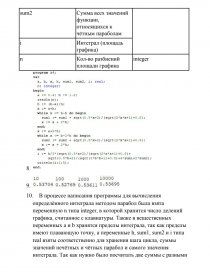 - В процессе написания программы для вычисления определённого интеграла методом парабол была взята переменную n типа integer, в которой хранится число делений графика, считанное с клавиатуры. Также в вещественных переменных a и b хранятся пределы интеграла, так как пределы имеют плавающую точку, а переменные h, sum1, sum2 и i типа real взяты соответственно для хранения шага цикла, суммы значений нечётных и чётных парабол и самого значения интеграла. Так как нужно было посчитать две суммы с разными начальными и конечными условиями, я использовал два цикла while: в каждом из которых считалась отдельная сумма при своих начальных и конечных условиях. Получившиеся суммы следует подставить формулу: которая дана в математической модели. Программа считает значение и выводит его на экран.