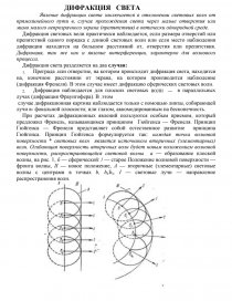 Дифракция световых воли практически наблюдается, если размера отверстий или препятствий одного порядка с длиной световых волн или если место наблюдения дифракции находится на большом расстояний от, отверстия или препятствия. Дифракция, так же как и явление интерференции, характерно для волнового процесса.