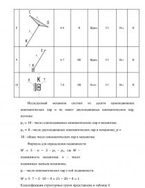 - Названия звеньев, количество кинематических пар и групп Ассура.