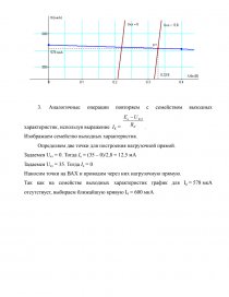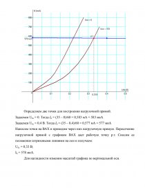 Наносим точки на ВАХ и проводим через них нагрузочную прямую. Пересечение нагрузочной прямой с графиком ВАХ дает рабочую точку р.т. Сносим ее положение штриховыми линиями на оси и получаем: