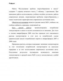 Работа “Исследование проблем энергосбережения в школе” содержит 7 страниц печатного текста, 2 таблицы, 1 приложение. При написании работы использовались учебные пособия для школы, работы современных авторов, затрагивающие проблемы энергосбережения, а также технические характеристики современных источников света.