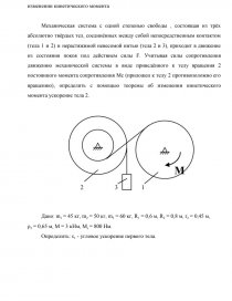 Механическая система с одной степенью свободы , состоящая из трёх абсолютно твёрдых тел, соединённых между собой непосредственным контактом (тела 1 и 2) и нерастяжимой невесомой нитью (тела 2 и 3), приходит в движение из состояния покоя под действием силы F. Учитывая силы сопротивления движению механической системы в виде приведённого к телу вращения 2 постоянного момента сопротивления Мс (приложен к телу 2 противоположно его вращению), определить с помощью теоремы об изменении кинетического момента ускорение тела 2.