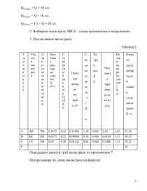 Узлы магистрали | Участки магистрали | Длины участков магистрали, м | Расчетные расходы на участке Q, м3/с | Стандартный диаметр труб d, м | Площади попереч. сеч. труб ω, м2 | Средние скорости: υ = Q / ω | Поправ. коэф. θi | Расходные характеристики K, м3/с | Потери напора на участке hl, м | Отметки пьезометрической линии в узлах магистрали П, м |