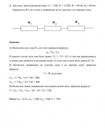 - Для цепи, представленной ниже, U3 = 25B, P3 = 12,5Bт, R1 = 40 Ом, R2 = 60 Ом. Определить R3 ток в цепи и напряжение на ее участках и на зажимах цепи.