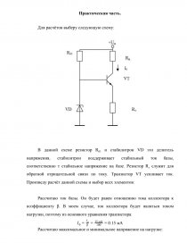 В данной схеме резистор Rб1 и стабилитрон VD это делитель напряжения, стабилитрон поддерживает стабильный ток базы, соответственно т стабильное напряжение на базе. Резистор Rэ служит для обратной отрицательной связи по току. Транзистор VT усиливает ток. Произведу расчёт данной схемы и выбор всех элементов: