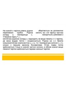 киплячою рідиною складу xn надходить на вище лежачу n+1 тарілку, де вона віддає тепло і конденсується. Рідина на n+1 багата низькокиплячим компонентом xn+1>xn, то і температура кипіння tn+1<tn (згідно з першим законом Коновалова). Отже, підвід тепла здійснюється тільки в нижній частині колони, а обігрів кожної вище лежачої тарілки здійснюється парами нижньої тарілки.