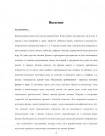 Компьютерные игры стали частью нашей жизни. В них играют как взрослые, так и дети. У каждого свои намерения в играх: провести свободное время, отвлечься от реальности, погрузиться в интересные миры и т. п. С каждым годом игры становятся всё интереснее и качественнее в плане сюжета, геймплея, графики и физики, перенесённой из реальности в игру. Но даже простые явления физики в трёхмерном пространстве на деле оказываются длинным и сложным программным кодом, на который у программистов уходит не одна неделя. С первого взгляда, кажется, что физика нашего и игрового кардинально отличается, но это всего лишь ошибки в программном коде, которых не избежать, но в конечном результате некоторые игры не отличить от реального мира и в графике, и в физике. Актуальность данной темы обусловлена требованиями - важность изучения физики в играх. В настоящее время дети очень увлечены Игрой на компьютере. Тема физики в компьютерных играх актуальна, потому что игроки хотят, чтобы игра была максимально реалистичной. Знание законов физики поможет Игрокам в построении стратегий для прохождения уровней с большей легкостью. Для сохранения интереса к изучению физики, можно разработать задачи, с использованием видеофрагментов из игр. Это позволит более заинтересовать учащихся, дав им возможность посмотреть на компьютерную игру с другой стороны, увлечь, заинтересовать их в освоении науки физики. Необходимость успешного изучения школьных дисциплин физики и информатики , даст возможность выпускникам, которые хотят стать разработчиками игр в будущем воссоздать процессы в видеоиграх основанные на законах физики.