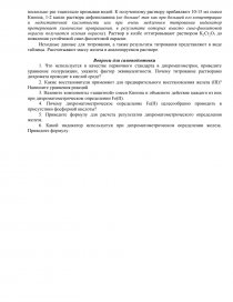 Определение железа основано на предварительном восстановлении Fe(III) до Fe(II) с помощью металлического цинка и титровании ионов Fe2+ стандартным раствором K2Cr2O7 с индикатором дифениламином в присутствии кислотной смеси (H3PO4 + H2SO4):
