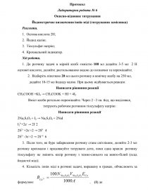 № З.п. | V Na2S2O3, мл, С(Na2S2O3)= 0,1 моль/л | V Na2S2O3, мл середнє значення | Молярна концентрація еквіваленту Cu2+, моль / л | Масова концентрація Cu2+, г/ л | Вміст Cu2+, г Формула (1) |