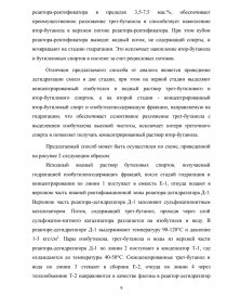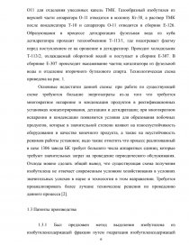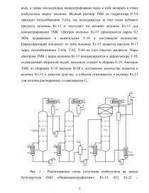 Обогрев колонны Кт-21 производится паром 0,5 МПа, подаваемым в кипятильник Т-22 в постоянном количестве. Азеотроп триметилкарбинола из куба колонны Кт-21 поступает в сборник Е-126. Пары азеотропа ТМК и легкие углеводороды с верха колонны Кт-21 поступают в дефлегматор Т-23, охлаждаемый оборотной водой, где конденсируется азеотроп ТМК. Парожидкостная смесь из дефлегматора Т-23 поступает в буфер О-24 для отделения легких углеводородов из жидкости. Сконденсировавшийся азеотроп ТМК, самотеком поступает в колонну Кт21 в качестве флегмы. Несконденсированные углеводороды С4 из буфера О-24 направляются на узел конденсации отдувок. Азеотроп триметилкарбинола после дегазации его от легколетучих углеводородов в колонне Кт-21 узла ректификации ТМК и возвратный ТМК из куба колонны Кт-145 узла выделения товарного ТМК поступает в сборник Е126, откуда в постоянном количестве насосом Н-28 подается на две параллельно работающие системы дегидрататации. В дегидрататорах Р-28 происходит реакция разложения триметилкарбинола с получением изобутилена и воды. Процесс идет при температуре 80 - 90 °С и давлении 0,5 МПа на формованном катализаторе КУ-2ФПП, расположенном в верхней части дегидрататоров. В нижней ректификационной части дегидрататора происходит полное исчерпывание триметилкарбинола ТМК из фузельной воды. Подвод тепла к дегидрататорам осуществляется через выносные кипятильники Т-29, обогреваемые паром 0,5 МПа. Пар в кипятильники подается в постоянном количестве. Пары, выходящие с верха дегидрататоров, поступают в конденсатор Т-30, где происходит конденсация ТМК и воды. Охлаждающая вода в конденсаторы Т-30 подается в постоянном количестве в зависимости от температуры отходящих паров изобутилена сырца. Конденсат поступает в сборник Е-111, откуда насосом Н-112 в постоянном количестве подается в дегидрататоры Р28 в качестве флегмы. Газообразный изобутилен, пройдя сепараторы О-31, поступает в сепаратор О11 для отделения унесенных капель ТМК. Газообразный изобутилен из верхней части сепаратора О-11 отводится в колонну Кт-38, а раствор ТМК после конденсатора Т-10 и сепаратора О-11 отводится в сборник Е-126. Образующаяся в процессе дегидратации фузельная вода из куба дегидрататора проходит теплообменник Т-113/1, где подогревает флегму перед поступлением ее на орошение в дегидрататор. Проходит холодильник Т-113/2, охлаждаемый оборотной водой и поступает в сборник Е-307. В сборнике Е-307 происходит высаживание частиц катализатора из фузельной воды и отделение вторичного бутилового спирта. Технологическая схема приведена на рис. 1.
