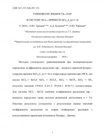 Соединения изотопнообогащенного кремния представляют фундаментальный и прикладной интерес как новые материалы и промежуточные вещества для получения индивидуальных высокочистых изотопов кремния [1-3]. Перспективным направлением является получение и изучение физико-химических свойств оптических материалов на основе кварцевого стекла с измененным относительно природного изотопным составом кремния и кислорода [4]. Известными способами получения кварцевого стекла являются MCVD – метод, золь – гель метод и ряд других, в которых применяется тетрахлорид кремния. Разделение изотопов кремния проводится с использованием его тетрафторида [1-3]. Методика конверсии тетрафторида кремния в тетрахлорид описана в [5-6], в том числе и для хлоридов кремния 28Si, 29Si, 30Si [6]. Она предполагает выдерживание тетрафторида кремния и хлорида алюминия(III) при повышенной температуре в закрытом реакторе. Особенностью данного метода является образование фторид - хлоридов кремния SiClF3, SiCl2F2, SiCl3F, как промежуточных продуктов обменной реакции SiF4 и AlCl3, их содержание в SiCl4 составляет n·10-3 - n·10-2 мол. дол. [5,6]. Проблема снижения содержания этих примесей актуальна, так как они являются потенциальным источником примеси фтора в кварцевом стекле, которая влияет на его свойства. Температура кипения веществ в ряду SiClF3 - SiCl2F3 - SiCl3F - SiCl4 монотонно увеличивается (203.15 К, 241.50 К, 285.35 и 330.15 К, соответственно [7,8]), что позволяет эффективно использовать дистилляционные методы для очистки тетрахлорида кремния от указанных веществ. Однако в литературе отсутствуют сведения о значениях коэффициента разделения жидкость – пар для фторид - хлоридов и тетрафторида кремния в тетрахлориде кремния, необходимые для рациональной организации процесса дистилляционной очистки тетрахлорида кремния от этих примесей.