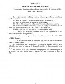 The purpose of the final qualification work is to develop recommendations for improving the financial condition of ООО «КРЦ «ЭФКО-Каскад».