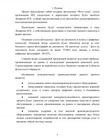 Проект представляет собой создание фотосалона “Фото плюс”, путем организации ИП, владельцем и директором которого будет являться Лазаренко В.П., в сфере предоставления услуг фотопечати, редактирования и восстановления фотоснимков.