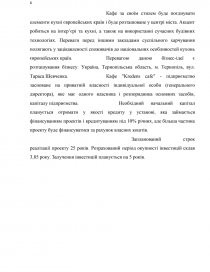 Головною метою створення закладу є проникнення на ринок і подальше розширення ринкової долі. Головною стратегією закладу повинна стати комплексна стратегія з надання продукції більш високого рівня якості, а також розширення асортименту послуг. Виходячи з цього стратегією маркетингу обирається стратегія розширення попиту за рахунок стимулювання обсягу продажів, цінової політики і нецінових факторів конкуренції, створення позитивного іміджу кафе. Обраний вид діяльності пояснюється перш за все наявністю досвіду у керівників закладу. Значну роль грає ситуація у галузі, яка забезпечує стійку норму прибутку за рахунок вірної орієнтації на потенційного споживача з середнім рівнем доходів. Керівництво закладу у своїй діяльності орієнтується на вивчення потреб і запитів споживачів і у якості однієї з головних задач підвищення якості продукції, що пропонується. Для створення кафе планується придбання спеціального обладнання, меблів, а виробничу будівлю взяти в оренду. Для виробництва продукції необхідно найняти 15 робітників. Кафе за своїм стилем буде поєднувати елементи кухні європейських країн і буде розташоване у центрі міста. Акцент робиться на інтер’єрі та кухні, а також на використанні сучасних будівних технологіях. Переваги перед іншими закладами суспільного харчування полягають у зацікавленості споживачів до національних особливостей кухонь європейських країн. Перевагою даною бізнес-ідеї є розташування бізнесу: Україна, Тернопільська область, м. Тернопіль, вул. Тараса Шевченка. Кафе "Kredens cafe" - підприємство засноване на приватній власності індивідуальної особи (генерального директора), яке має одного власника і розпорядника основних засобів, капіталу підприємства. Необхідний начальний капітал планується отримати у якості кредиту у установі, яка займається фінансуванням проектів і кредитуванням під 10% річних, але більша частина проекту буде фінансуватися за рахунок власних коштів. Запланований строк реалізації проекту 25 років. Розрахований період окупності інвестицій склав 3,85 року. Залучення інвестицій планується на 5 років.