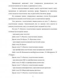В бухгалтерии проверяются целевое использование средств, наличие оправдательных документов, подтверждающих произведенные расходы, правильность их оформления и подсчета сумм. К учету принимаются авансовые отчеты, проверенные арифметически, по существу в отношении целесообразности и необходимости расходов, соответствия их назначению аванса и утвержденные руководителей организации. Бухгалтер обрабатывает авансовый отчет, проставляя на документах и на отчете корреспондирующие счета, отвечающие направлению расхода.