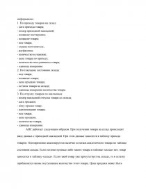 АИС работает следующим образом. При получении товара на склад происходит ввод данных с приходной накладной. При этом данные заносятся в таблицу прихода товаров. Одновременно анализируется наличие остатков аналогичного товара по таблице состояния склада. Если остатки нулевые либо такого товара в таблице «склад» нет, товар заносится в таблицу «склад». Если такой товар уже присутствует на складе, то к остатку прибавляется вновь поступившее количество этого товара. Цена продажи может быть назначена из условия фиксированного процента наценки. Таблица отпуска товара заполняется каждый раз при выписке очередной накладной покупателю. При этом одновременно должна происходить коррекция остатка товара на складе. Выписка накладной покупателю происходит путем выбора товаров из списка-перечня товаров на складе. При этом для каждого выбранного
