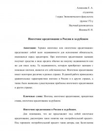 Ключевые слова: Ипотека, ипотечное кредитование, процентная ставка, ипотечное кредитование за рубежом.
