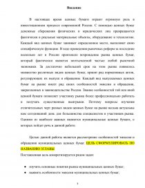 В настоящее время ценные бумаги играют огромную роль в инвестиционном процессе современной России. С помощью ценных бумаг денежные сбережения физических и юридических лиц превращаются фактически в реальные материальные объекты, оборудование и технологию. Каждый вид ценных бумаг занимает определенное место, выполняет свою специфическую функцию. В ходе проведения рыночных реформ за последние несколько лет в России произошло возрождение рынка ценных бумаг, который фактически является неотъемлемой частью любой рыночной экономики. За достаточно небольшой срок на этом рынке появилось множество различных видов ценных бумаг, принят ряд нормативных актов, регулирующих их выпуск и обращение. Каждый вид выпускаемых ценных бумаг на рынке имеет ряд своих особенностей эмиссии и обращения, закрепленных в законодательстве России. Знание особенностей той или иной ценной бумаги позволяет участнику рынка более профессионально работать и получать существенные выигрыши. Поэтому вопросы изучения отличительных черт разных видов ценных бумаг на рынке весьма актуальны нам сегодняшний день для большинства специалистов и участников рынка. Одними из наиболее важных являются муниципальные ценные бумаги, о которых пойдет речь в данной работе.