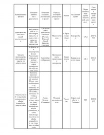 Наименование проекта | Описание проекта и его результатов | Компания (холдинг), реализующая проект | Отрасль, в которой реализуется проект | Регион | Населенный пункт | Общая необходимая сумма инвестиций, млн долл. | Срок начала и завершения реализации проекта |