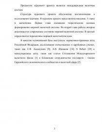 Структура курсового проекта обусловлена поставленными в исследовании задачами. В курсовом проекте представлены введение, 3 главы и заключение. Первая глава посвящена теоретическим основам формирования мировой валютной системы. Во второй главе работы автором анализируется современное состояние мировой валютной системы. В третьей определяются перспективы мировой валютной системы.