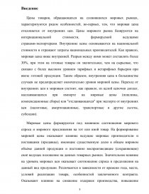 Цены товаров, обращающихся на сложившихся мировых рынках, характеризуются рядом особенностей, во-первых, тем, что мировая цена отклоняется от внутренних цен. Цены мирового рынка базируются на интернациональной стоимости, формируемой ведущими странами-экспортерами. Внутренние цены основываются на национальной стоимости и отражают затраты национальных производителей. Как правило, мировая цена ниже внутренней. Разрыв между ними может составлять более 30%, при этом на готовые товары он значительнее, чем на сырьевые, что связано с более высоким уровнем тарифных и нетарифных барьеров при ввозе готовой продукции. Таким образом, внутренняя цена в большинстве случаев не предопределяет окончательно уровня мировой цены. Переход от внутренних цен к мировым состоит, как правило, из целой цепочки доплат, наслаивающихся при импорте на мировые цены (пошлины, компенсационные сборы) или "отслаивающихся" при экспорте от внутренних цен (налоговые, амортизационные, транспортные и другие льготы, субсидии).