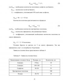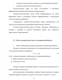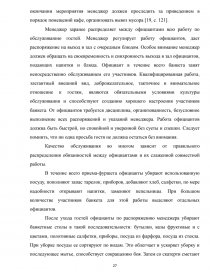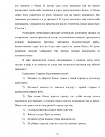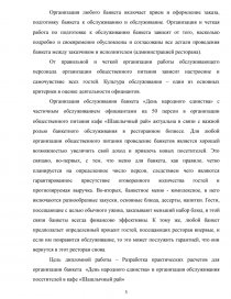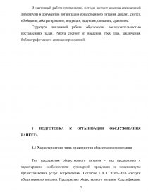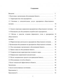 Введение ……………………………………………………………………….. 1 Подготовка к организации обслуживания банкета………………………… 1.1 Характеристика типа предприятия………………………………………... 1.2 Основные и дополнительные услуги предприятия общественного питания…………………………………………………………………………….. 1.3 Анализ структуры управления предприятием общественного питания.. 1.4 Помещения для обслуживания потребителей в предприятии…………... 1.5 Методы и средства создания фирменного стиля в предприятии общественного питания……………………………………………………………… 1.6 Маркетинговая деятельность предприятия общественного питания…... 2 Организация обслуживания на предприятии общественного питания…... 2.1 Роль менеджера в организации и обслуживании банкета………………. 2.2 Прием заказа на обслуживание банкета………………………………….. 2.3 Товароведческая характеристика основного сырья……………………... 2.4 Оформление нормативной документации………………………………... 2.5 Расчет материальных средств для проведения банкета…………………. 2.6 Обслуживание гостей на банкете…………………………………………. 3 Расчет показателей эффективности банкета……………………………….. Заключение……………………………………………………………………... Список использованных источников…………………………………………. Приложение А………………………………………………………………….. Приложение Б………………………………………………………………….. Приложение В………………………………………………………………….. Приложение Г………………………………………………………………….. | 3 7 7 10 11 16 18 20 24 24 28 3341 41 51 56 5963 66 69 73 81 |