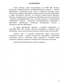 Во время практики я ознакомилась с деятельностью отдела досуга и творчества молодежи, с основными документами, с профессиональными и должностными обязанностями специалистов структурного подразделения, активно участвовала в хозяйственной и правовой деятельности учреждения, а также оказывала помощь сотрудникам в подготовке и проведении мероприятий, выполнила индивидуальное задание на практику.