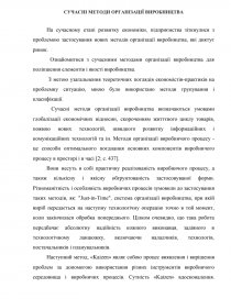 Сучасні методи організації виробництва визначаються умовами глобалізації економічних відносин, скороченням життєвого циклу товарів, появою нових технологій, швидкого розвитку інформаційних і комунікаційних технологій та ін. Методи організації виробничого процесу - це способи оптимального поєднання основних компонентів виробничого процесу в просторі і в часі [2; с. 437].