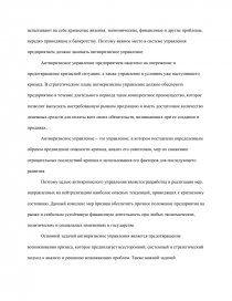 Антикризисное управление предприятием нацелено на опережение и предотвращение кризисной ситуации, а также управление в условиях уже наступившего кризиса. В стратегическом плане антикризисное управление должно обеспечить предприятию в течение длительного периода такое конкурентное преимущество, которое позволит выпускать востребованную рынком продукцию и иметь достаточное количество денежных средств для оплаты всех своих обязательств, возникающих при ее создании и продажах.