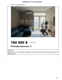 Об’єкт оцінки | трикімнатна квартира загальною площею 83 кв. м., в тому числі житлова площа -51 кв. м., розташована за адресою: Київ, Регенераторна вул., 4, Дніпровський р-н |