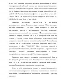 В течение 1997-98 г. для Sakhalin Energy Investment Company выполнено работ по монтажу телефонно-компьютерных кабельных систем и систем электроснабжения, а также поставлено оборудования на сумму более 250 тыс. долларов. В это же время нами были спроектированы и введены в эксплуатацию структурированные кабельные системы для СахНИРО, для помещений международного сектора аэропорта г, Южно-Сахалинск, для комплекса 777 и в здании Сахалинской таможни в г. Холмске.