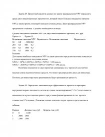 Задача 29. Проектный аналитик должен по закону распределения NPV определить среди двух инвестиционных проектов тот, который имеет большее ожидаемое значение NPV, а также проект, имеющий меньшую степень риска. Закон распределения NPV представлен в таблице. Сделайте необходимые выводы.