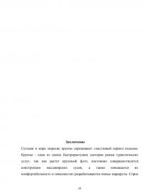 Таким образом, необходимо изучать зарубежные круизные компании, их маршруты, обслуживание на судне и другое, чтобы успешно развивать данную отрасль в России, что обуславливает актуальность данной курсовой работы.