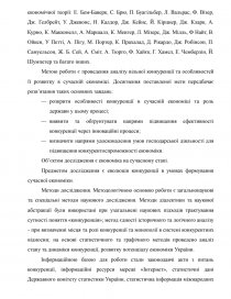Методи дослідження. Методологічною основою роботи є загальнонаукові та спеціальні методи наукового дослідження. Методи діалектики та наукової абстракції були використані при узагальнені наукових підходів трактування сутності поняття «конкуренція»; метод єдності історичного та логічного аналізу - при визначенні місця та ролі конкуренції та монополії в системі конкурентних відносин; на основі статистичного та графічного методів проведено аналіз стану та динаміки конкуренції, розвитку потенціалу економіки України.