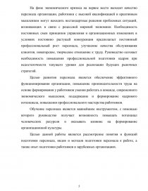 На фоне экономического кризиса на первое место выходит качество персонала организации, работники с высокой квалификацией и креативным мышлением могут находить нестандартные решения проблемных ситуаций, возникающих в связи с рецессией мировой экономики. Необходимость постоянных смен принципов управления и организационных изменениях в условиях постоянно растущей конкуренции предполагает постоянный профессиональный рост персонала, улучшение качества обслуживания клиентов, новаторское, творческое отношение к труду. Руководство осознает необходимость повышения профессиональной подготовки кадров при недостаточности текущего уровня для реализации будущих рыночных стратегий.